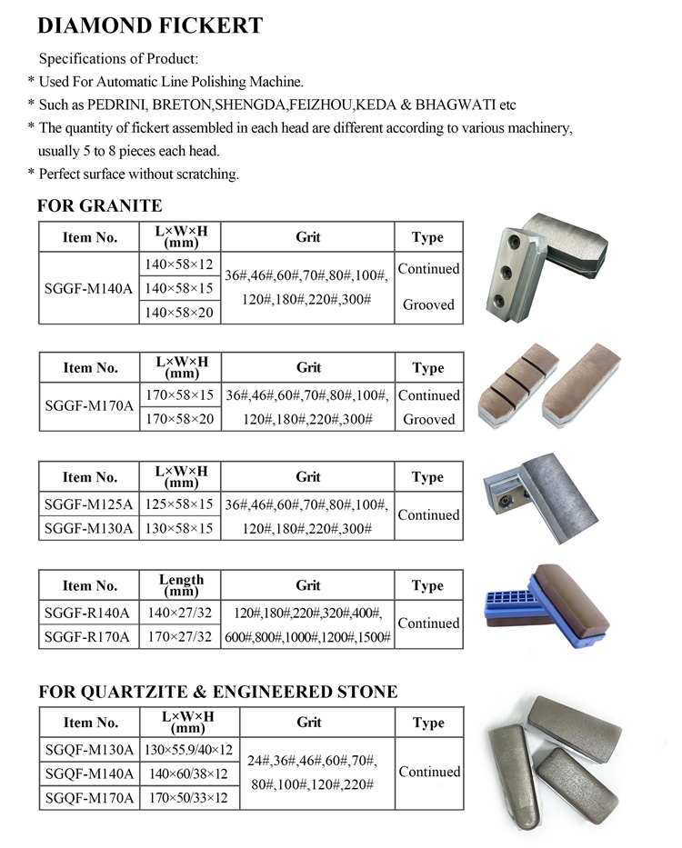 SANG Diamond Tools предлагает высококачественные алмазные фикерты на металлической связке диаметром 140 и 170 мм, специально разработанные для шлифования и калибровки гранитных поверхностей. Наши фикерты, разработанные для длительного срока службы, высокой точности шлифования и стабильной производительности, идеально подходят для автоматических полировальных линий и ручных станков.