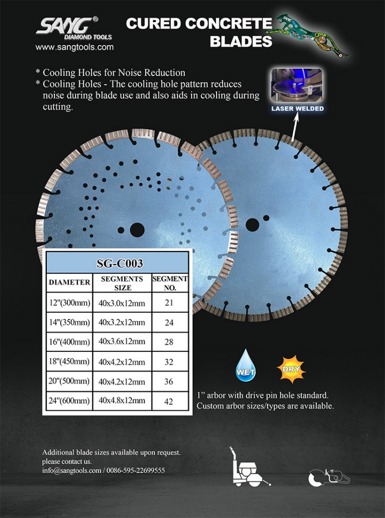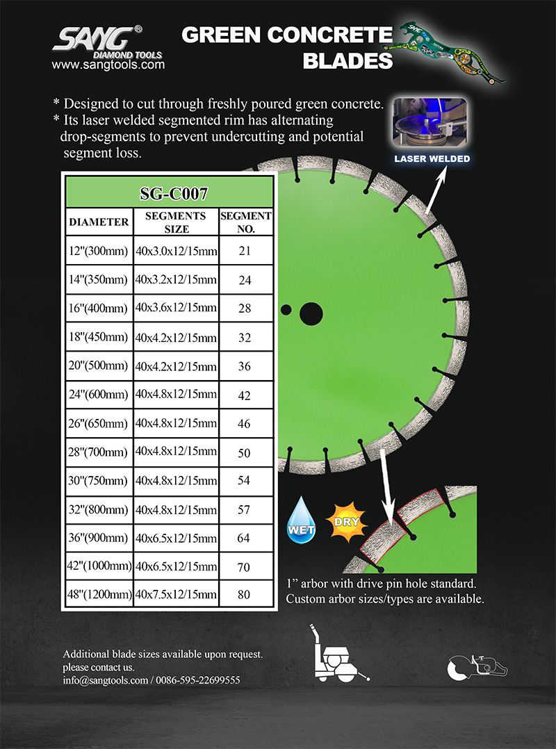 SANG Green Cut Blade – Специально разработано для пил раннего ввода в эксплуатацию с мягкой связующей матрицей для борьбы с абразивностью свежего бетона.